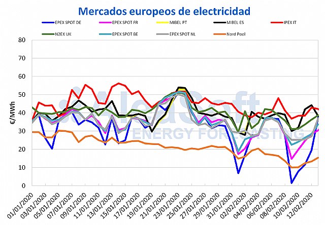 Los precios de los mercados eléctricos del centro norte de Europa bajaron a principios de esta semana, mientras que en los del sur subieron ligeramente. La variabilidad de la eólica es la causa principal. En mercados como el alemán y el francés la producción eólica subió, mientras que en los del sur del continente bajó. El 10 de febrero se produjo un récord de producción fotovoltaica instantánea en España. En los mercados de combustibles se mantiene el sentimiento bajista por la amenaza del coronavirus