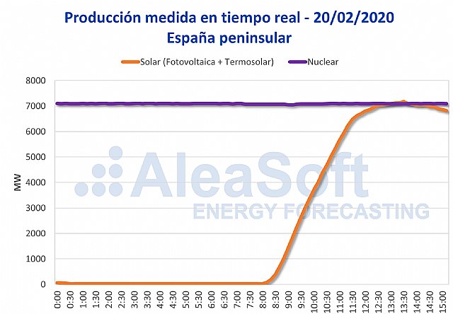 Un nuevo récord en la producción renovable se suma a los registrados en Europa en los últimos días. En España se impuso hoy 20 de febrero a las 13:30 un récord de producción fotovoltaica instantánea de 5650 MW, según datos provisionales medidos en tiempo real de Red Eléctrica de España (REE). A esto se suma que por primera vez en la historia, la producción solar en España, que incluye la fotovoltaica y la termosolar, supera a la producción nuclear. A las 13:30 se generaron 7176 MW con energía solar, sobrepasando en 84 MW a los 7092 MW producidos por la nuclear.