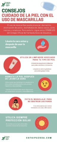 El uso de mascarillas puede provocar en la piel del rostro problemas como: dermatitis, obstrucción de poros, deshidratación, labios secos, acné o marcas y rozaduras, entre otros. Con el objetivo de aportar a la ciudadanía pautas que pueden contribuir a evitarlos el Colegio Oficial de Farmacéuticos de Gipuzkoa (COFG) ofrece una serie de consejos como, entre otros, hidratar la piel y utilizar siempre protección solar, ya que los rayos ultravioleta penetran a través de las mascarillas