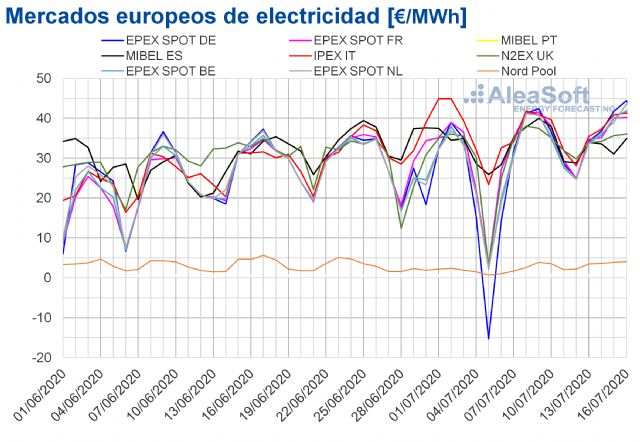 Los primeros cuatro días de la semana del 13 de julio hubo incrementos de precios en la mayor parte de los mercados eléctricos europeos analizados respecto a los de los mismos días de la semana anterior. La excepción fue el mercado MIBEL de España y Portugal, donde se produjo un descenso del 5,5%. Por otra parte, la mayor subida de precios, del 63%, fue la del mercado Nord Pool de los países nórdicos. Mientras que los mercados N2EX de Gran Bretaña, EPEX SPOT de Francia e IPEX de Italia tuvieron los menores incrementos de precios, del 3,1%, el 3,4% y el 3,6% respectivamente. En el resto de los mercados, los aumentos de precios estuvieron entre el 14% del mercado EPEX SPOT de Bélgica y el 21% del mercado EPEX SPOT de Alemania.