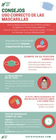Ante la obligatoriedad de uso, el COFG considera fundamental informar a la ciudadanía sobre el correcto uso de las mascarillas ya que, “no basta con llevarlas, hay que utilizarlas bien”. Entre los errores más comunes figuran que la nariz no esté cubierta por la mascarilla, tocarla con las manos, guardarla en el bolsillo o creer que con la mascarilla quirúrgica –la más utilizada en Gipuzkoa-, estamos protegidos. “Este tipo de mascarilla sirve, no tanto para evitar contagiarnos, sino para evitar contagiar a los demás, por eso es tan importante que la llevemos todos”, subraya el presidente del COFG.