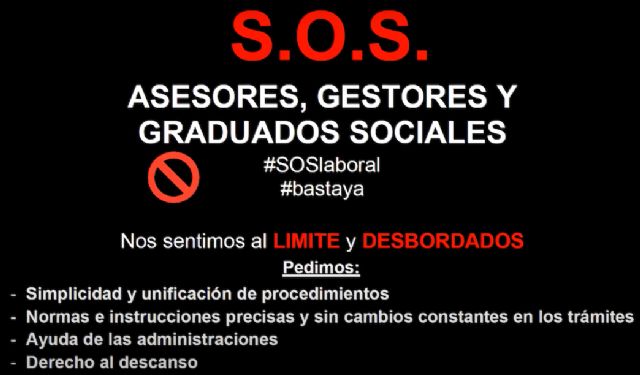 A raíz de esta situación, de la que parece que la administración estatal se desentiende, se ha formado un colectivo de afectados del sector de las asesorías denominado ‘S.O.S Basta ya’, con página en Change.org y que ya ha reunido más de 1.700 firmas de personas que apoyan la causa. Su objetivo es representar a los Graduados Sociales, Abogados laboralistas, Gestores, RRHH, que se sienten al límite y desbordados por la situación actual ante la falta de previsión por parte de las administraciones.