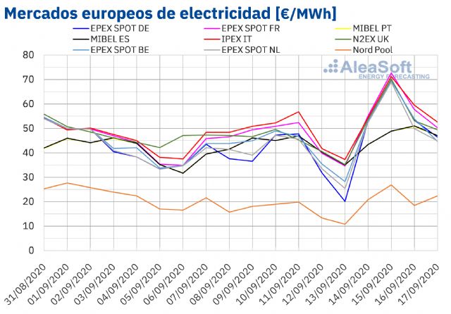 Del lunes 14 al jueves 17 de septiembre, los precios diarios se mantuvieron por encima de los 40 €/MWh en casi todos los mercados eléctricos europeos. La excepción fue el mercado Nord Pool. En este mercado los precios diarios estuvieron entre los 18,51 €/MWh del miércoles 16 de septiembre y los 26,87 €/MWh del martes 15 de septiembre.