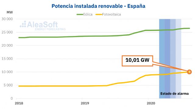 Observando el gráfico de la evolución de la potencia renovable instalada en España durante los últimos meses, apenas se puede percibir parón alguno durante los meses más críticos de la crisis en marzo y abril. Los expertos consideran que el retraso medio que puede haber acumulado un proyecto nuevo de eólica o fotovoltaica debido a las medidas contra la pandemia no supera los treinta días. La prueba más evidente de ello es el hito de los 10 GW de fotovoltaica alcanzados en todo el territorio español, cuando hace poco más de un año estaba por debajo de los 5 GW.