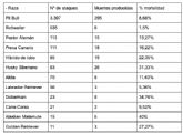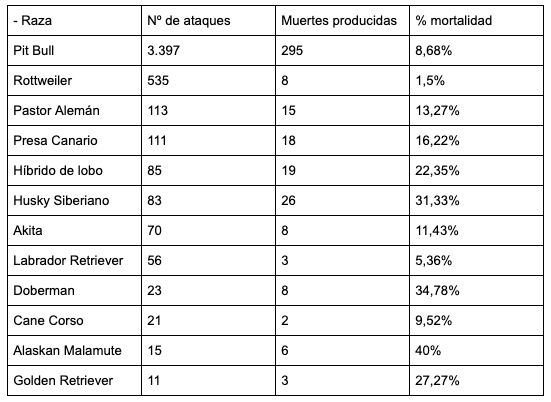 Desde el año 2010 en España han muerto alrededor de 22 personas por ataques de perros; sin embargo, no se encuentran estadísticas que señalen el número total de ataques ni las razas que los han protagonizado, por lo que no se puede identificar el porcentaje de mortalidad a lo largo de estos años en el país ni se puede estimar cuáles son las razas más agresivas.