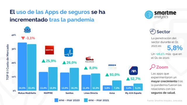 La transición hacia el formato digital ha afectado a todos los sectores y el de los seguros no ha sido una excepción. Durante esta crisis sanitaria su labor se ha vuelto fundamental en un entorno más online que nunca y aunque el uso de aplicaciones en el sector de seguros aún no está generalizado, sí que se observa un incremento paulatino de su uso entre una población cada vez más amplia. De hecho, según un análisis llevado a cada por Smartme Analytics, la plataforma líder en la recopilación de datos en tiempo real del comportamiento de los usuarios en el entorno digital, el uso de las aplicaciones en el sector seguros ha crecido un 68,3% en España en solo tres años. Tanto es así que, en 2020, un 6,9% de la población utilizó alguna de estas apps, frente al 4,1% que lo hacía en 2018. Al analizar el uso de este tipo de apps, entre enero y marzo de 2021 respecto al mismo período del año anterior, se observa un incremento del 26%.