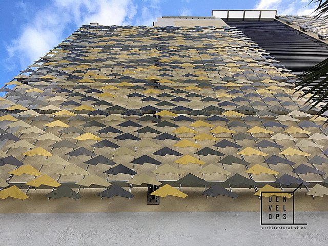 A diferencia de la arquitectura textil o las mallas metálicas (referentes para este tipo de soluciones), que generan imágenes y sombras con tamices de grano muy fino, Denvelops® ha desarrollado revestimientos en base a modulaciones de entre 10 y 40 cm, que permiten generar texturas de proporciones más afines a las celosías y fachadas de piezas de hormigón o cerámicas. Y, sobre todo, que permite que las piezas de acabado también puedan ser extrafinas.