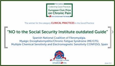 CONFESQ, la Coalición Nacional de Entidades de Fibromialgia, Encefalomielitis Miálgica/ SFC, Sensibilidad Química Múltiple y Electrohipersensibilidad, ha sido galardonada con el Premio Cívico Europeo al Dolor Crónico- III edición por el proyecto #NoalaGuiaINSS, concedido por la Organización Active Citizenship Network. El mismo día se anunció la retirada definitiva por parte del Instituto Nacional de la Seguridad Social de la Guía objeto de la campaña premiada, confirmada oficialmente por este organismo