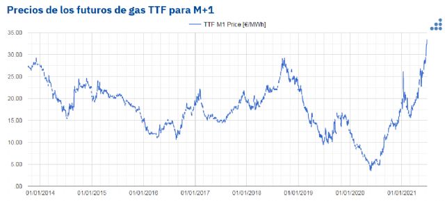 Actualmente los precios del gas TTF se encuentran en máximos históricos, con valores por encima de 33 €/MWh. Los futuros para el mes M+1 en el mercado ICE no habían alcanzado nunca estos niveles de precios, al menos desde octubre de 2013. En el mercado spot sucede algo similar. Al menos desde octubre de 2008 no se habían superado estos valores, excepto en algunas situaciones puntuales de precios muy altos.