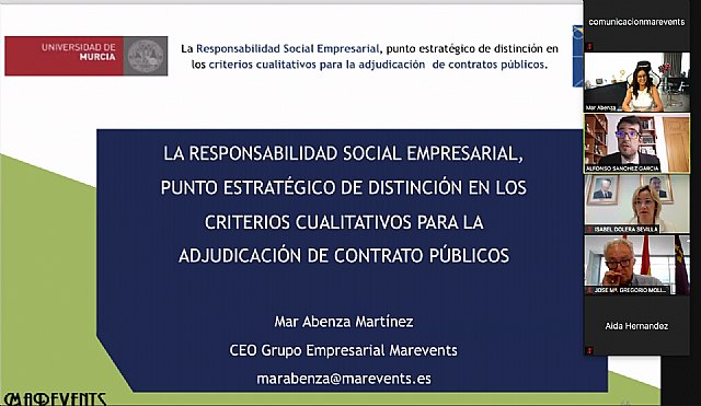 La Universidad Internacional del Mar, UNIMAR, de la Universidad de Murcia, ha organizado esta mañana un curso sobre “Las cláusulas Sociales en la Ley 9/2017 de Contratos del Sector Público: Propuestas de Desarrollo e Implementación. El Papel de los Órganos de Contratación y el de los Operadores Económicos”. Curso en el que ha participado como ponente Mar Abenza, CEO de la empresa de Marevents Comunicación Global, para hablar de la Responsabilidad Social Empresarial como punto estratégico de distinción en los criterios cualitativos para la adjudicación de contratos públicos.