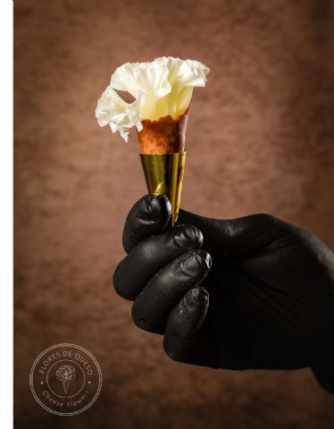 Como colofón final, las Flores de Queso se sirven en cucuruchos de galleta con sabores como; sésamo negro, cacao, fresa, albahaca, remolacha, chili picante, alga nori, pesto, vainilla ó limón, y con distintas emulsiones dulces dentro del cucurucho de membrillo, mango, frutos rojos, dátiles ó pimientos rojos.