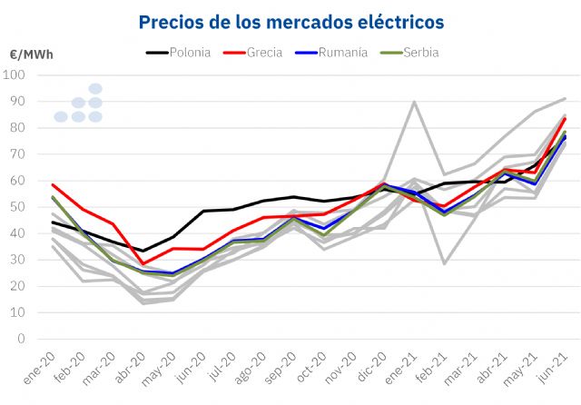 La evolución de los mercados de Polonia, Grecia, Rumanía y Serbia fue similar a la del resto de los mercados europeos durante 2020 y la primera mitad de 2021. En los primeros meses de 2020 los precios bajaron por el efecto de la pandemia y a partir de ahí subieron a la par que los precios del gas y de los derechos de emisión de CO2.