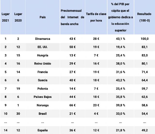 Dinamarca tiene las mejores condiciones para estudiar en línea, aunque al mismo tiempo, es el país con las clases en línea más caras. En Noruega, el coste mensual medio de una conexión a Internet de banda ancha es el más elevado. En Brasil invierten un 33 % del PIB per cápita en educación superior, mientras que en España solo el 21,8 %. Estos y otros datos forman parte de la segunda edición de un estudio publicado por Preply, la plataforma de aprendizaje en línea, que analiza las condiciones que permiten contar con un e-learning y una educación digital exitosos en 32 países de todo el mundo.