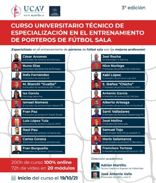 Fruto de este objetivo nace la 3ª Edición Curso Universitario Técnico de Especialización en Entrenamiento de Porteros de Fútbol Sala. Formación universitaria completamente online tutelada por la Universidad Católica de Ávila, donde de una manera sencilla y dinámica se muestran los aspectos más relevantes del entrenamiento de porteros de fútbol sala.