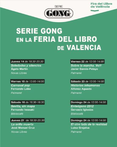Serie Gong, la editorial de Gonzalo García-Pelayo, a punto de cumplir un año, tras su participación en la pasada Feria del Libro de Madrid, avanza con velocidad de crucero y potencia su buena trayectoria con la presencia de sus autores en La Feria del Libro de Valencia, del 14 al 24 de octubre.