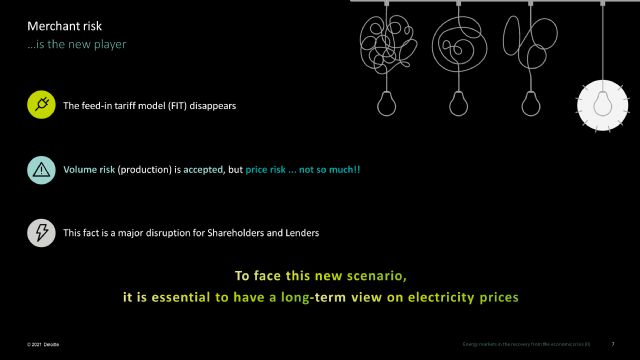 En el webinar se comentó que, una vez prácticamente desaparecida la feed-in tariff y teniendo en cuenta que el riesgo de volumen es aceptado, el nuevo protagonista de la financiación de proyectos de energías renovables es el riesgo de mercado. De ahí la importancia de que todos los actores del mercado, accionistas, inversores y entidades crediticias, cuenten con una visión de futuro de los precios a la hora de invertir y prestar dinero.