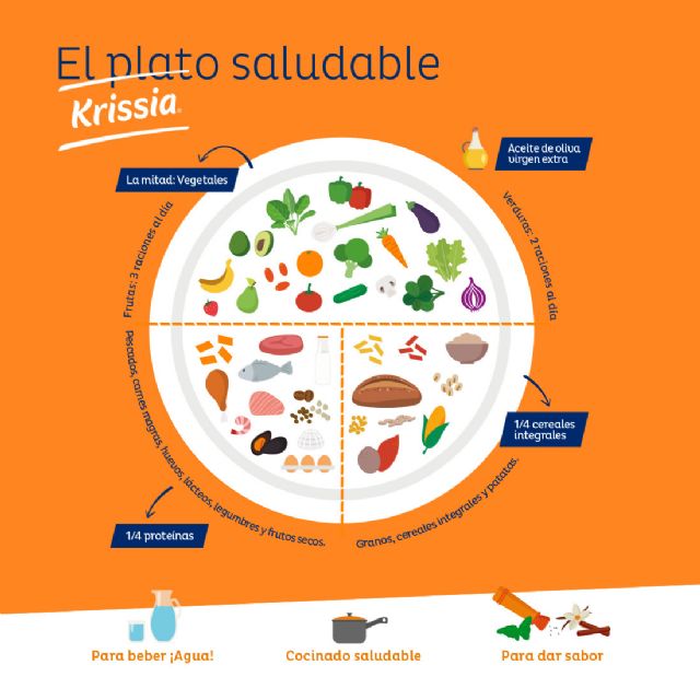 El plato saludable Krissia® te puede ayudar a identificar las cantidades correctas que debes ingerir de los diferentes grupos de alimentos, de tal manera que asegures una correcta y equilibrada ingesta de todos los nutrientes.