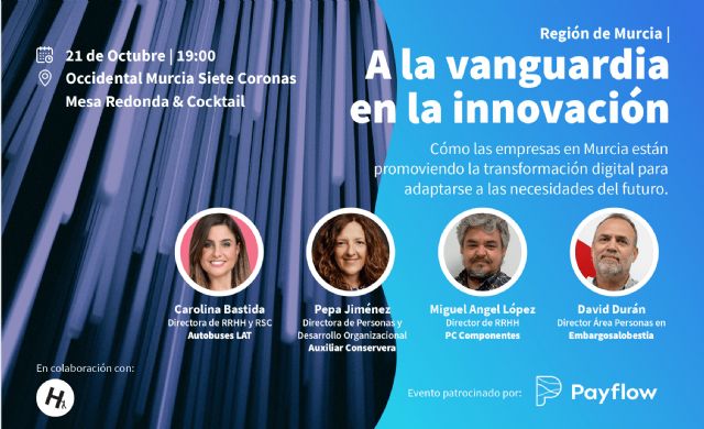 La Asociación Dirección Humana de la Región de Murcia y Payflow, en colaboración con ADIMUR, Colabora Mujer, Foro ilusionado, ENAE y Murcia Economía, analizarán cómo las empresas de Murcia están promoviendo la transformación digital para adaptarse a las necesidades del futuro en la jornada 'A la vanguardia en la innovación. Región de Murcia'.