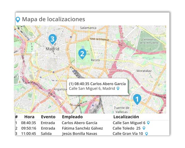 Dentro de las últimas mejoras, se incluye un mapa de ubicaciones por empleado o por grupo, donde encontrará información relevante como: la localización móvil de los fichajes laborales. También podrá realizar la gestión de los dispositivos para fichar, pudiendo restringir dispositivos con los que podrá fichar el empleado. También puede establecer ubicaciones geográficas o lugares de trabajo con etiquetas personalizadas como "Oficina Central" o "Taller de las Ramblas".