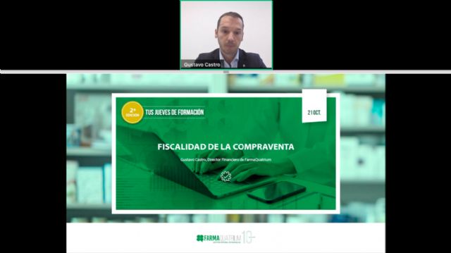 . El director financiero de FarmaQuatrium, Gustavo Castro, ha analizado todos los pormenores de la "Fiscalidad en la compraventa de una farmacia" en la que ha sido la 3ª sesión formativa del módulo "Oportunidades en la transmisión de farmacia", dentro del programa "Tus Jueves de Formación", que tenía lugar el jueves por la mañana