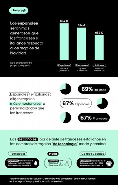 Aunque europeos y muy cercanos a nivel geográfico, españoles, franceses e italianos son también muy diferentes en algunos aspectos, como los hábitos de consumo. Así, por ejemplo, los españoles son los más generosos a la hora de comprar regalos de Navidad para sus seres queridos, tal y como revela el estudio "Consumers who buy gifts for others for Christmas", realizado por la compañía líder en el segmento "Buy Now, Pay Later" Clearpay.