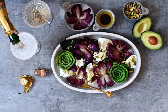 Ensalada festiva con rosas de aguacate y flores de cebolla morada