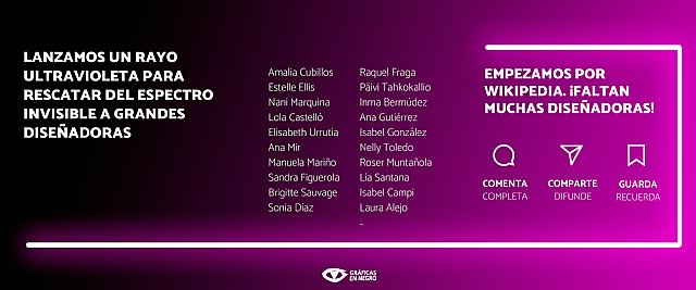 El Día de la Mujer sirve de arranque a una acción abierta y participativa para arrojar luz sobre aquellas diseñadoras que todavía no están representadas en la mayor fuente de consulta del mundo, Wikipedia. La reconocida plataforma será la aliada para equilibrar la balanza. Actualmente el filtro ultravioleta de Gráficas en Negro ha detectado que la presencia de mujeres diseñadoras en esta plataforma no llega al 15% del total de artículos (1.700) sobre profesionales del diseño gráfico e industrial.