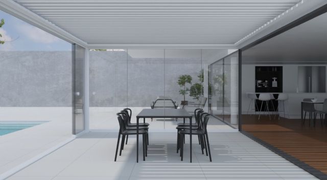 Una de las soluciones que aporta Glass by Gaviota es su gama Climatika, en la que destacan sus icónicas pérgolas. Son elementos caracterizados por líneas sencillas y neutras, donde no se percibe la tornillería, oculta entre perfiles. También permite controlar el clima, ya que las lamas giratorias del techo protegen de lluvia o nieve en los meses más fríos, y suponen una total protección de los rayos del sol en verano. Asimismo, ofrece un sinfín de posibilidades de personalización, ‘un paso más’ en la adecuación al hogar ideal.