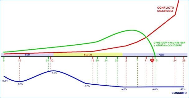 Fruto de esta investigación sobre qué provoca las decisiones, entre ellas las de consumo, se elaboró la teoría de la Curva de Vida de Las líneas de pensamiento, que son las que modulan las decisiones de compra que se ve con el iTB. En la gráfica de abajo se ve la Curva de la Vida de dos líneas de pensamiento distintas pero muy interrelacionadas, de la que se deduce y explica el porqué de la caída del consumo en las últimas quincenas: la Curva de Vida de la línea de pensamiento en “contra de las vacunas Usa y las medidas de Occidente contra el Covid”, y por otro la Curva de Vida de la línea de pensamiento de la “Confrontación USA/Rusia en Ucrania”.