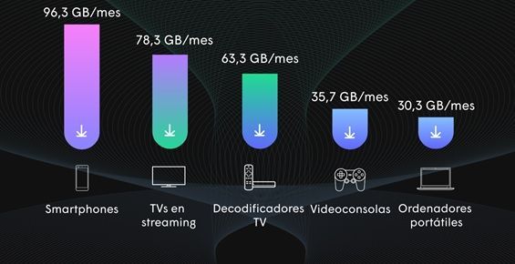 Por su parte, las TVs en straming y los decodificadores, encabezan el segundo y tercer puesto, con un consumo de datos de hogar de 78,3 GB/mes y 63,3 GB/mes, respectivamente.