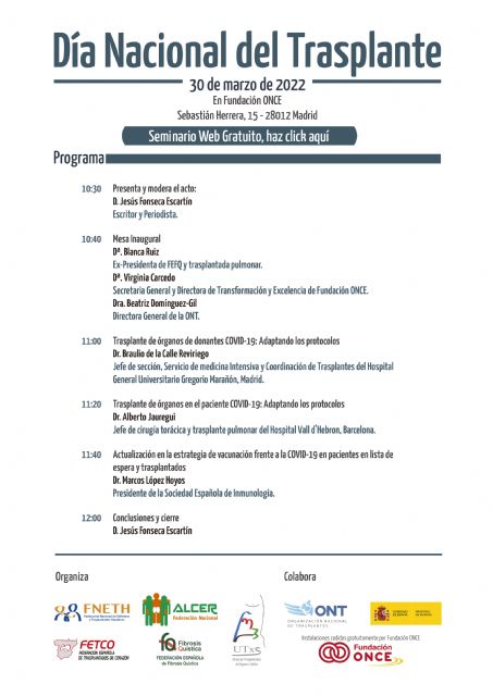 El acto, que estará conducido por el escritor y periodista Jesús Fonseca, contará con varias ponencias centradas en la adaptación de los protocolos de donación y trasplante al actual escenario dominado por la pandemia de COVID-19, así como en la estrategia de vacunación frente a la misma para pacientes trasplantados o en lista de espera.