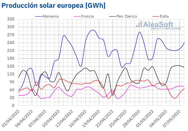 En la primera semana de mayo, la producción solar aumentó un 12% en Alemania y un 2,6% en la península ibérica respecto a la última semana de abril. En España, el día 6 de mayo, el conjunto de la fotovoltaica y la termosolar sumó 143 GWh, el valor más alto de la historia, favorecido en gran parte por la alta producción fotovoltaica, que ese día registró la máxima producción instantánea hasta el momento, de 12 335 MWh a las 14:00. En Portugal, los días 7 y 8 de mayo fueron los de mayor producción solar de la historia, con un total que superó los 10 GWh cada día. Por otra parte, en Italia y Francia la producción solar descendió un 32% y un 3,7%, respectivamente, en la semana del 2 de mayo. Aunque en el conjunto de la semana la producción con esta tecnología descendió en el mercado francés, el día 7 de mayo se registró el tercer valor más alto de la historia, de 75 GWh, después de los 79 GWh del 26 de abril y de los 78 GWh del 1 de mayo, ambos de este mismo año.