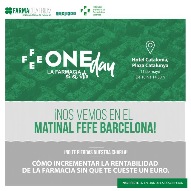 En el Matinal, organizado por la Federación Empresarial de Farmacéuticos Españoles, tendrá lugar el miércoles 11 de mayo en la capital catalana. El director financiero de FarmaQuatrium, empresa patrocinadora del evento y líder nacional en compraventa de Farmacias por 4° año consecutivo, con Domingo Ortega, creador de DataFarma, se encargarán de desarrollar la ponencia Incrementa la rentabilidad de tu farmacia sin que te cueste un euro, que comenzará a las 13:30h de este miércoles, 11 de mayo.