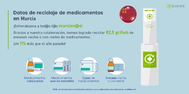 En 2021, cada murciano depositó en el Punto SIGRE de la farmacia 82,5 gramos de envases vacíos o con restos de medicamentos, una cifra que supone un incremento del 11% respecto al ejercicio anterior, según se desprende del informe anual de actividad presentado por SIGRE a las autoridades medioambientales de la Región de Murcia.
