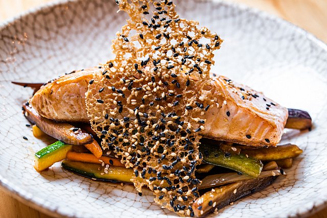 Las propiedades del salmón para la salud son sobradamente conocidas, pero entre las más destacadas están que ayuda a prevenir y combatir el colesterol, a mejorar la presión arterial así como disminuir el riesgo de arritmia cardíaca, pero hay otras muchas que no son tan conocidas y que tienen que ver con los beneficios para la piel. En este plato además del salmón, nos encontramos con un montón de verduras muy interesantes por todo lo que aportan a la salud de nuestra epidermis, como son el ajo, la zanahoria, el pimiento y el kale, a los que se añade aceite de sésamo y soja para conseguir el toque oriental.