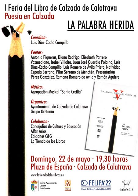 Antonia Piqueras, Diana Rodrigo, Elisabeth Porrero, Isabel Villarta, Juan José Guardia Polaino, Luís Díaz-Cacho, Luís Romero de Ávila, Natividad Cepeda, Pilar Serrano de Menchén, Presentación Pérez González, Ramona Romero de Ávila y Ramón Aguirre, declamarán en la calzadeña Plaza de España, a las 19,30 horas, del domingo día 22 de mayo, con el acompañamiento de la Agrupación Musical 'Santa Cecilia'.