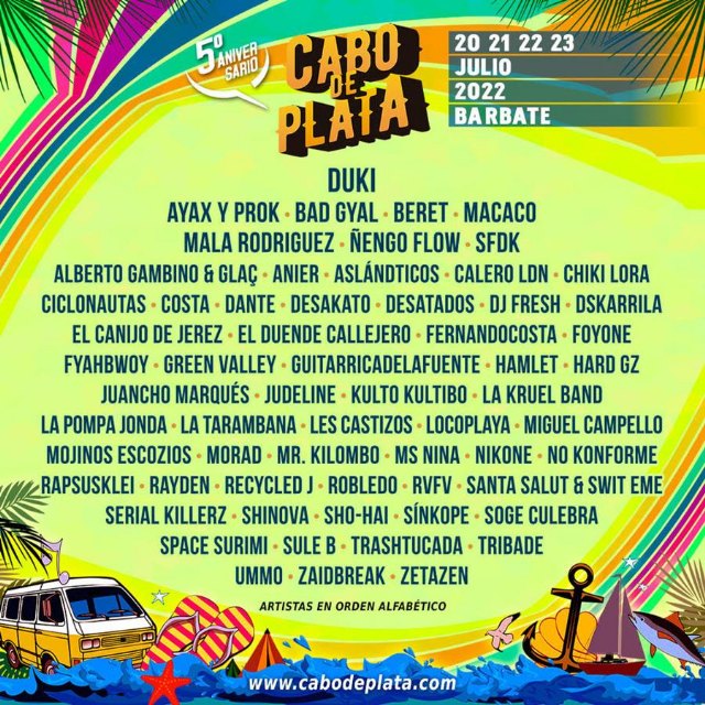 Otros artistas confirmados: AYAX y PROK, SFDK, BERET, MACACO, MALA RODRIGUEZ, BAD GYAL, GREEN VALLEY, MOJINOS ESCOZIOS, EL CANIJO DE JEREZ, ÑENGO FLOW, HAMLET, SHINOVA, ALBERTO GAMBINO & GLAÇ, ASLANDTICOS, RAYDEN, LOCOPLAYA, ALBERTO GAMBINO & CLAÇ, FYAHBWOY, SHINOVA, RAYDEN, FERNANDOCOSTA, MIGUEL CAMPELLO, ASLANDTICOS, SHO HAI, COSTA, DESAKATO, LOCOPLAYA, JUANCHO MARQUÉS, FOYONE, TRASHTUCADA, CHIKI LORA, DANTE, CALERO LDN, DSKARRILA, MORAD, MR KILOMBO, LES CASTIZOS, SÍNKOPE, KULTO KULTIBO, LA TARAMBANA, NIKONE, SOGE CULEBRA, MS NINA, LA POMPA JONDA, TRIBADE, HARD GZ, LA KRUEL BAND, NO KONFORME, RECYCLED J, SERIAL KILLERZ, SANTA SALUT & SWIT EME, SULE B, ZAIDBREAK, ZETAZEN y UMMO del 20 al 23 de julio en la playa gaditana de Barbate.