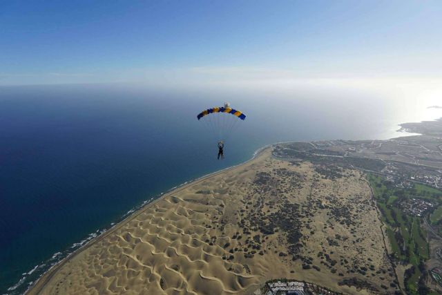 La propuesta de adrenalina que presentan los profesionales de iJump consiste en una emocionante caída libre a más de 200 k/h, seguida por un tranquilo vuelo en paracaídas sobre Playa del Inglés antes de aterrizar suavemente en las famosas Dunas de Maspalomas.