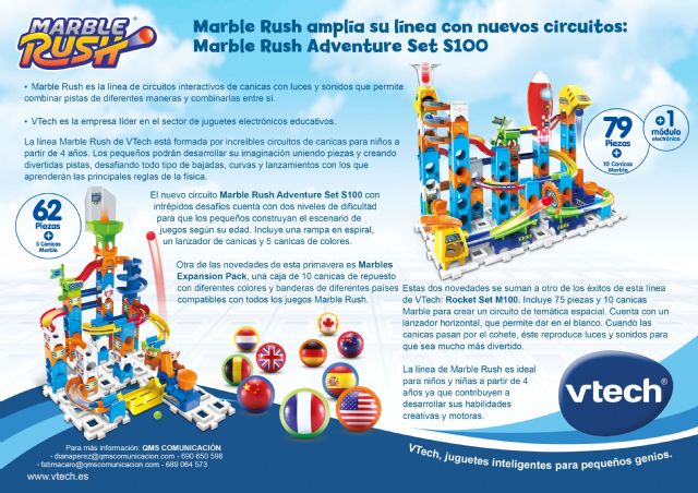Estas dos novedades se suman a otro de los éxitos de esta línea de VTech: Rocket Set M100. Incluye 75 piezas y 10 canicas Marble para crear un circuito de temática espacial. Cuenta con un lanzador horizontal, que permite dar en el blanco. Cuando las canicas pasan por el cohete, éste reproduce luces y sonidos para que sea mucho más divertido.