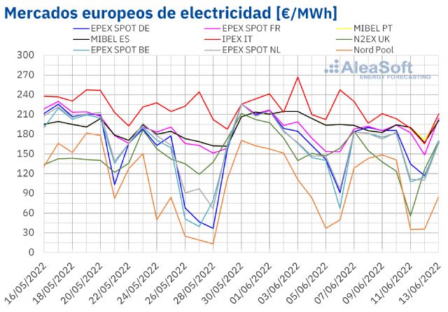 Las previsiones de precios de AleaSoft Energy Forecasting indican que en la semana del 13 de junio los precios de los mercados eléctricos europeos podrían aumentar influenciados por el descenso de la producción eólica y el incremento de la demanda en la mayoría de los mercados. Sin embargo, la entrada en funcionamiento el 14 de junio del Real Decreto-ley 10/2022 que topa los precios del gas usados de referencia en el mercado ibérico podría favorecer el descenso de los precios en este mercado.