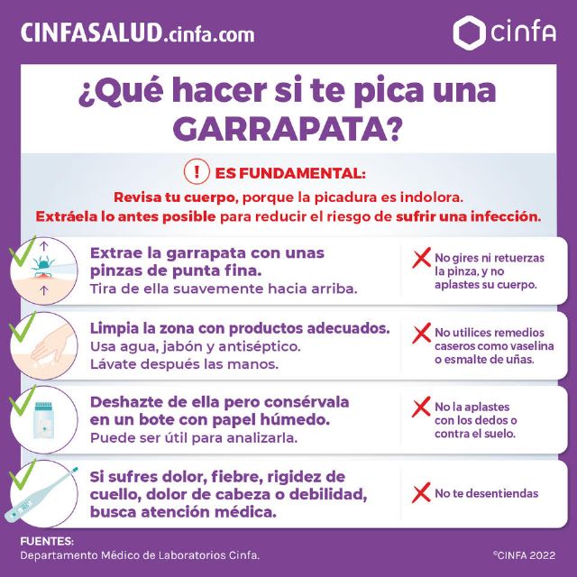 Si ya se ha producido la picadura, es necesario extraer la garrapata cuanto antes, sujetándola con unas pinzas de punta fina y roma, lo más cerca posible de la piel, y tirando de ella suavemente hacia arriba, evitando aplastarla. Posteriormente, debemos lavar la zona con agua, jabón y antiséptico e introducir el parásito en un bote cerrado con un papel húmedo, por si fuera necesario analizarlo. Si quedara alguna parte de la garrapata bajo la piel, se debe buscar atención médica, al igual que si, durante las semanas siguientes, notásemos síntomas como dolor intenso en la zona, fiebre o rigidez en el cuello. "En cualquier caso, cuando practicamos actividades al aire libre en zonas de riesgo, podemos tomar algunas precauciones que reducirán el riesgo de picadura de garrapata", concluye.
