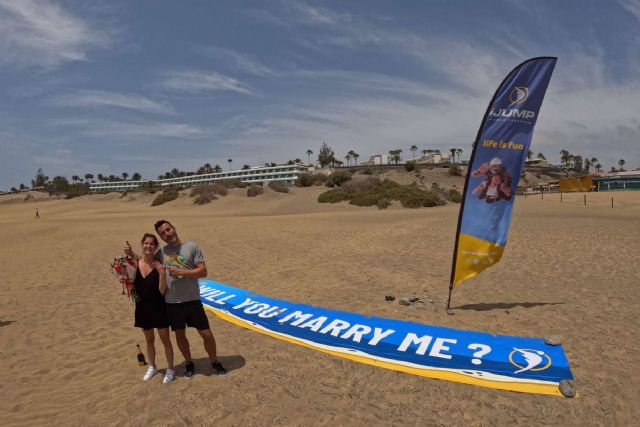 Existe una gran cantidad de ideas creativas para realizar una pedida de mano. Actualmente, una de las que están más de moda es hacer una proposición de matrimonio en los aires, ya que puede ser una experiencia inolvidable. En este contexto, iJump ofrece una aventura de caída libre en paracaidismo tándem sobre el océano Atlántico. La experiencia consiste en que, mientras los novios vuelan por el enorme cielo, se muestra una gran pancarta con la frase "¿Te casarías conmigo?" y, al llegar al suelo, se entregan flores y se hace un brindis para celebrar el "sí quiero".