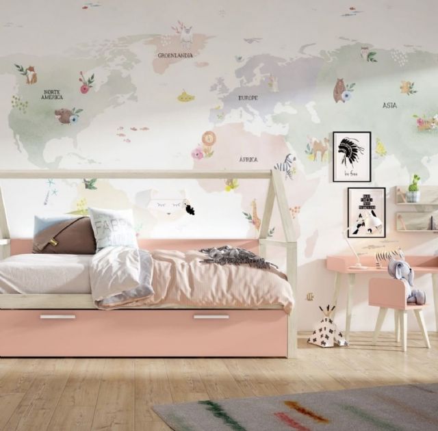 Los colores pastel predominan en este tipo de decoración. “La clave de este estilo reside en las paredes, por lo que elegir el papel pintado correcto será la gran decisión a tomar. Un gran mural puede marcar la diferencia de una estancia, el problema es que hay que atreverse a jugar con texturas y colores y eso a los padres les da algo de miedo, pero cuando se deciden el resultado es increíble”, explica Ivana González Mena, directora de Menamobel. Lo recomendado es utilizar el papel solo en la pared principal y en cuanto a los muebles elegirlos con tonos pastel y que combinen con el escritorio. En este tipo de decoración hay que tener cuidado con no sobrecargar la estancia por lo que a la hora de elegir las cortinas es mejor que sean blancas para que dejen pasar muy bien la luz. Una alfombra en el suelo dará el toque acogedor a este dormitorio juvenil.