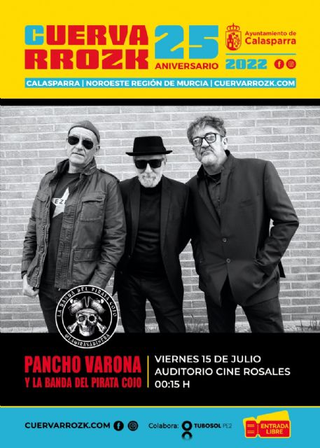 La Banda del Pirata Cojo estrena la programación de conciertos de la 25ª edición del Cuervarrozk con “La gira sabinera”. La formación, integrada por tres grandes músicos que han trabajado con lo mejor de la industria musical de España y liderada por Pancho Varona actúa en el escenario principal del Cuervarrozk este viernes 15 de julio (Auditorio Cine Rosales).
