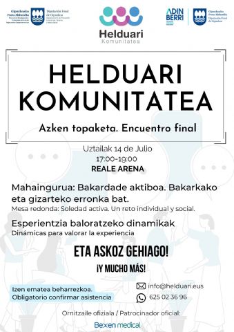 Helduari Komunitatea, la comunidad online para cuidar de la salud física y mental de las personas 55+ de Gipuzkoa, ha sido una iniciativa impulsada por el Colegio Oficial de Enfermería de Gipuzkoa (COEGI), Oniversity -la Universidad on line de Seniors Activos-, y la empresa Bat, Bi ta Hiru, especializada en participación y desarrollo comunitario. La iniciativa, que ha llevado por lema “Lidera tu momento”, arrancó en marzo con el objetivo de crear una comunidad online que, mediante charlas, mesas redondas, la interacción en foros o el planteamiento de retos, ayudara a las personas participantes a liderar su futuro y cuidar de su salud física, mental y emocional. Y todo ello con una atención totalmente personalizada.
