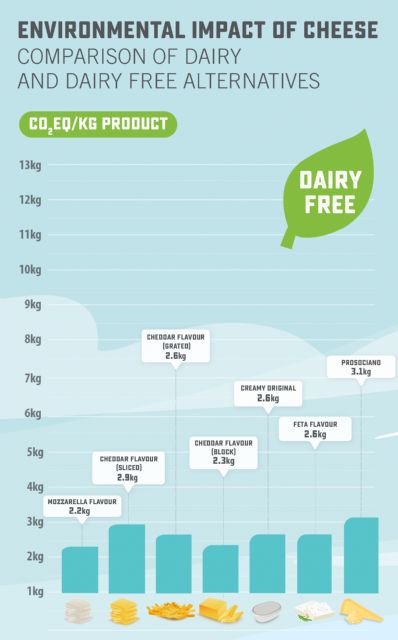 Las variedades más populares de queso lácteo como manchego, cheddar, mozzarella, feta y parmesano producen entre 6,4 y 13,3 kg de dióxido de carbono (eq) por kilo durante su ciclo de vida, según el estudio de la consultora de sostenibilidad Quantis. En comparación, los impactos climáticos de las alternativas veganas como Violife son sustancialmente más bajos y generan como mínimo 3,8 kg menos de carbono 11 por kilo, el equivalente a conducir un automóvil 11 km.
