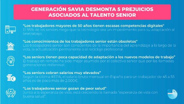 Generación SAVIA, proyecto de la Fundación Endesa en colaboración con la Fundación máshumano que cuatro años impulsando el talento senior, ha recopilado una serie de datos que contradicen los cinco tópicos más frecuentes asociados al colectivo de trabajadores mayores de 50 años. Habitualmente, se piensa que los seniors no tienen capacidad de adaptación, que sus conocimientos están obsoletos, que sus competencias digitales son escasas, que cobran sueldos muy elevados o que su salud es peor que la de los trabajadores más jóvenes.