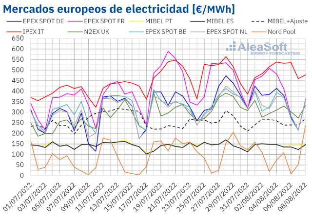 La combinación de la caída de la demanda de electricidad, por el comienzo del período de vacaciones al empezar el mes de agosto, y de una mayor producción eólica y solar favorecieron el descenso de los precios de los mercados eléctricos europeos, a pesar de registrar un ligero aumento en los precios del gas y de los derechos de emisión de CO2.