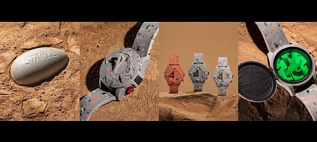 Cada reloj está fabricado con un movimiento automático, una caja de acero inoxidable (44 mm), una exclusiva funda de caja de silicona inspirada en la piedra de terrazo y correas (22 mm) de silicona. Las tres combinaciones de colores inspiradas en la piedra de terrazo recuerdan a la tierra recién excavada, a los restos de escombros en las calles de la ciudad y a la paleta de colores única e identificativa de STAPLE. El logotipo de la paloma de STAPLE está estampado en el fondo de la caja y las letras "STAPLE" están grabadas en la trabilla de la correa. Cada reloj se presenta en una caja coleccionable de edición limitada con forma de huevo (que juega con la idea de "Fossil" (fósil) y las excavaciones) y su precio es de 299€.