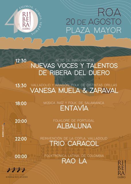 Roa será este sábado día 20 de agosto el escenario de las celebraciones de los 40 años de la Denominación de Origen Ribera del Duero. La localidad burgalesa, sede del Consejo Regulador, acoge un festival musical de "Los Sonidos del Duero: música de las diferentes orillas". Agrupaciones y artistas llegados de distintos puntos de Castilla y León y Portugal pondrán banda sonora a una jornada donde el vino volverá a ser el gran protagonista.